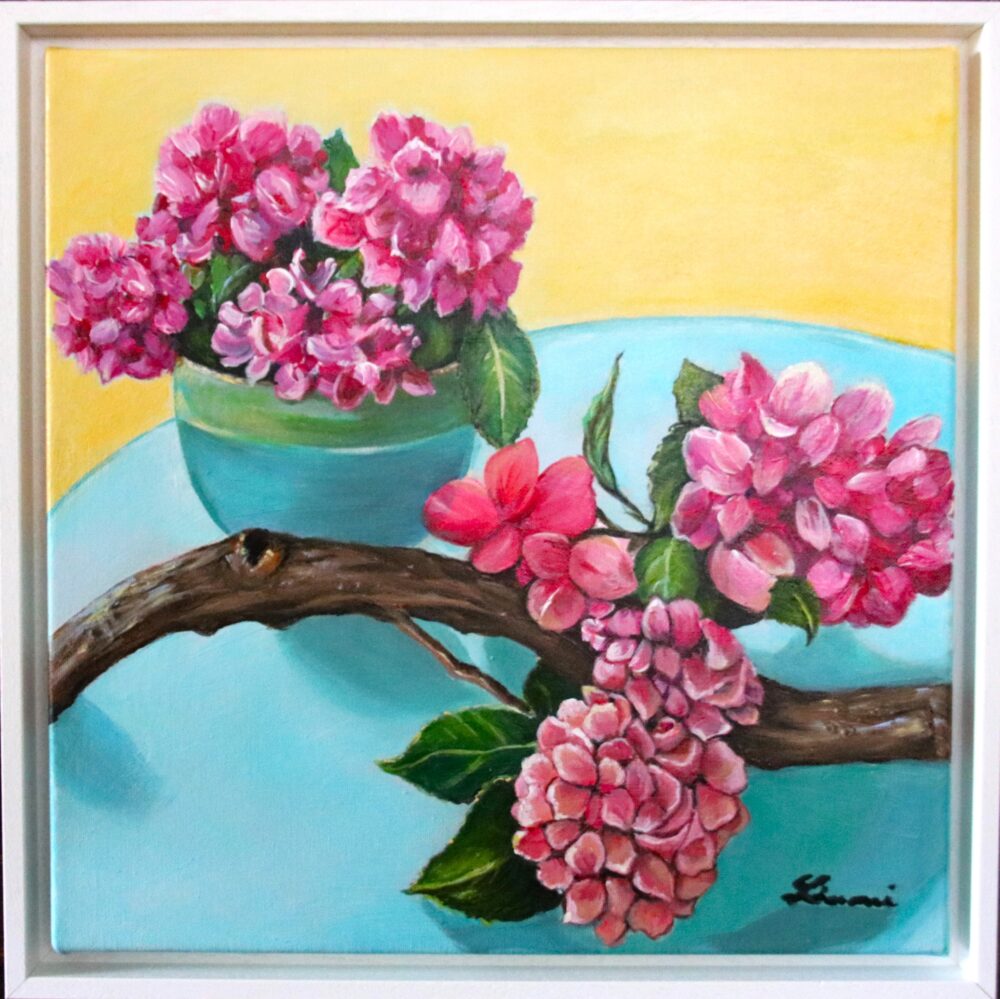 Bei grauen, regnerischem Wetter habe ich dieses Bild gemalt. Ich habe mir damit die Sonne in mein Interieur geholt. Farben die bei uns Sommergefühle aufkommen lassen und das auch mitten im Winter. Das Bild ist mit einem weissen Schattenfugenrahmen augestattet und kann direkt aufgehängt werden.